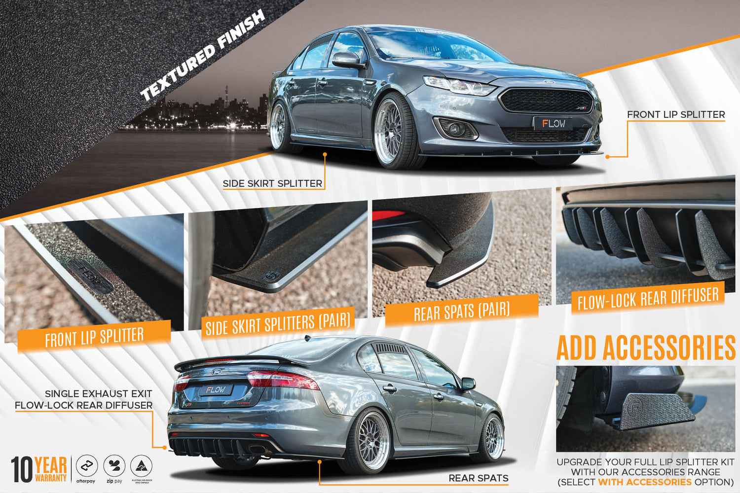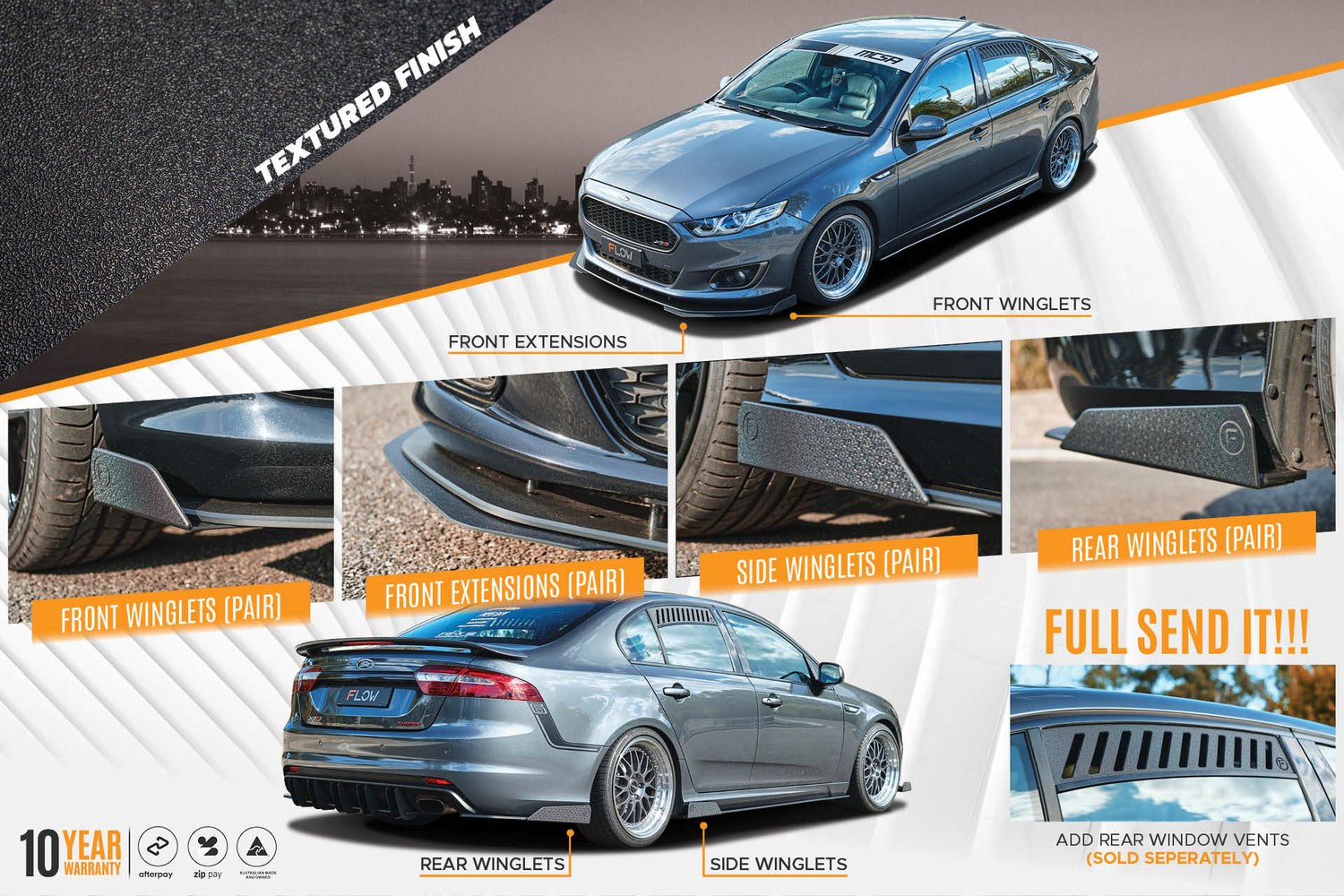 The new Flow Designs splitter set for Falcon FGX XR6 & XR8 offers a gloss or textured finish and includes front/side splitters & rear spats/Flow-Lock rear diffuser. Pre-pressed in threaded brass inserts accept all our add-on accessories for the FGX such as winglets and front splitter extensions.