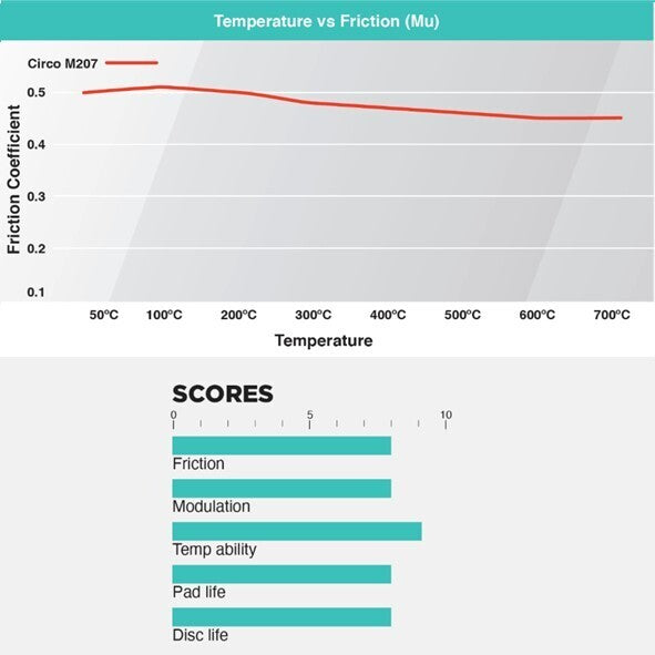 CIRCO M207 is the Heavy-Duty sprint and mid-enduro compound in the CIRCO range with exceptionally consistent torque characteristics at all temperatures making it a must have for professional circuit racing at the very highest levels. M207 is extremely capable at higher temperatures where other compounds simply give up. Suitable for sprint, mid distance and Endurance racing with very low wear at high temperatures and is very kind to disc condition.